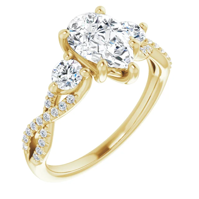 A three-stone engagement ring features a stunning central diamond or gemstone, flanked by two complementary stones on either side. This elegant design symbolizes the past, present, and future of your relationship, making it a deeply meaningful choice. The trio of stones enhances the overall brilliance and adds a sense of balance and harmony to the ring. With its timeless sophistication, the three-stone design not only showcases the beauty of the central stone but also creates a captivating and enduring statement of love.